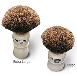 The pure badger faux-ivory shave brush shows less colour differential along the length of the hair than the magnificent Silvertip. This soft hair is very fine and most commonly used in shaving brushes.