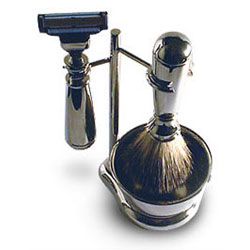 Bulbous handle Mach 3 razor, pure badger shaving brush, stand & bowl, in nickel finish.